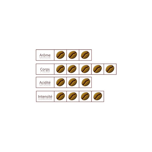 Ce café est issu d'un mélange de Robusta et d'Arabicas qui par son corps et son intensité, donne lieu à un instant exceptionnel de saveurs prolongées.