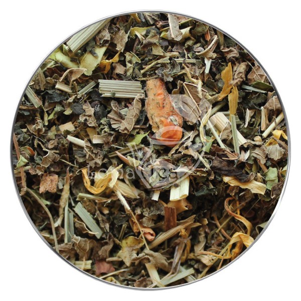 Ingrédients : feuilles de mélisse, feuilles d'ortie, citronnelle, feuilles de Moringa, baies de Goji, morceaux de pommes, feuilles de souci jaunes, pétales de rose, thé Matcha.