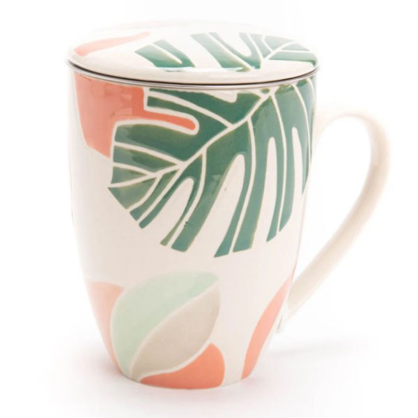 Voici un mug peint à la main, avec couvercle et filtre en inox pour faire infuser votre thé en vrac. Donnez du style avec votre pause thé grâce à cette jolie tisanière aux couleurs harmonieuses et son décor tropical.