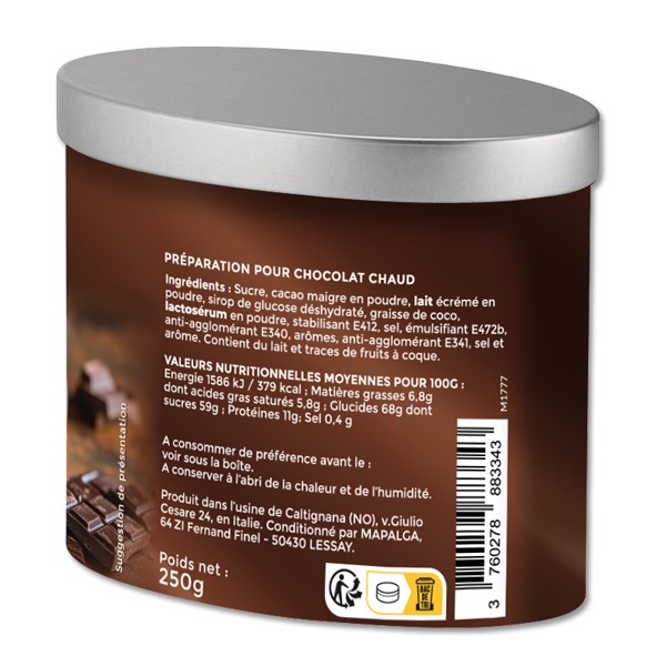 250g de préparation pour chocolat chaud conditionné dans une boîte métal.