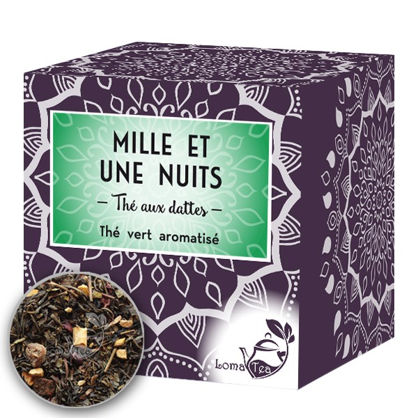 Ingrédients : Thé vert, dattes, arômes, cubes de caramel (sucre, sirop de glucose, sorbitol E420, émulsifiant E471), gingembre, réglisse.