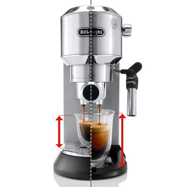 La Dedica Style de DELONGHI permet facilement de préparer un café unique ou 2 cafés simultanés, mais aussi d'utiliser des dosettes ESE grâce aux différents filtres fournis.